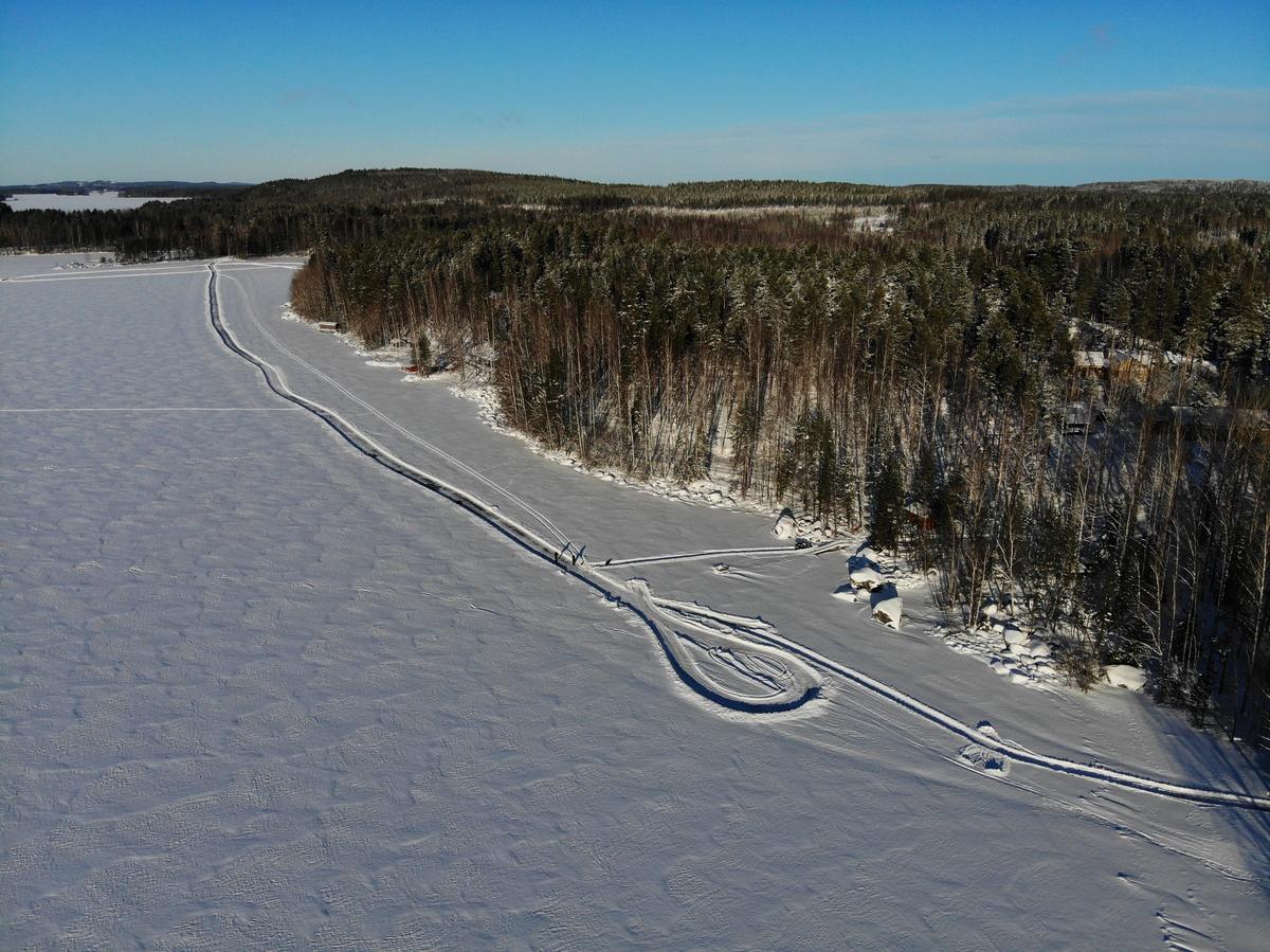 Aurattu reitti kulkee osittain jäällä Leppälahden uimarannalta kohti venesatamaa.